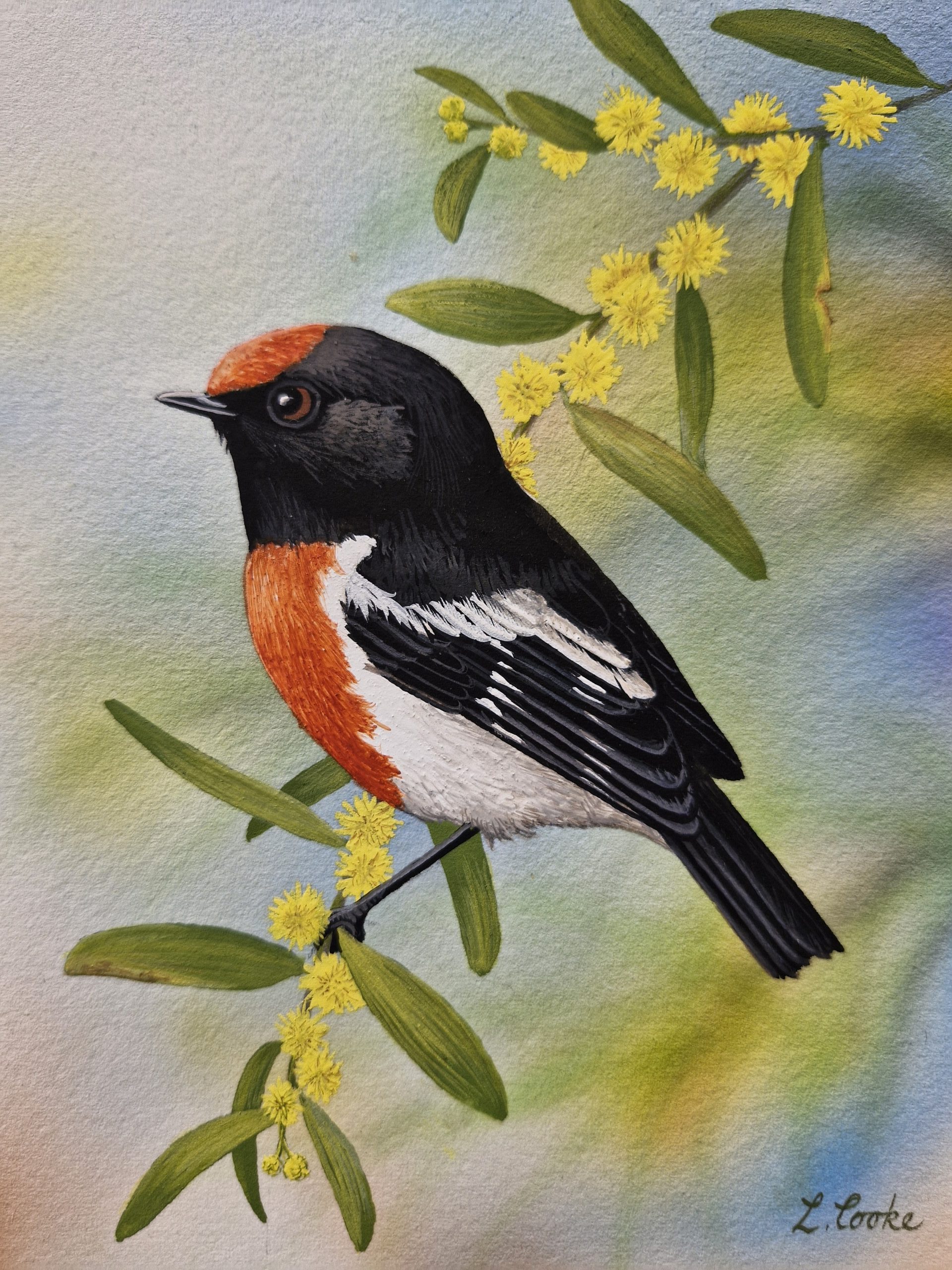 “Red-capped Robin” 123 X 160 mm. Matted to fit 200 X 250 mm (8 X 10) frame. $155